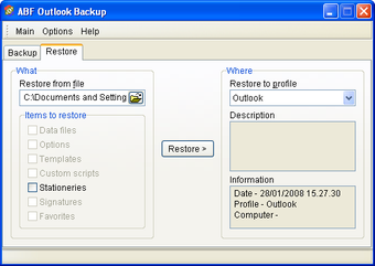 ABF Outlook Backup è dotato di un’interfaccia minimale, molto intuitiva, facile anche per gli utenti meno esperti. Tutte le funzioni di backup possono essere attivate singolarmente o contemporaneamente: devi solo selezionare quello che vuoi salvare e indicare un file di destinazione. Dalla scheda "Restore" di ABF Outlook Backup puoi ripristinare il file di backup con un semplice clic. Attenzione però: la versione di prova ti consente di ripristinare solo messaggi e dati.
